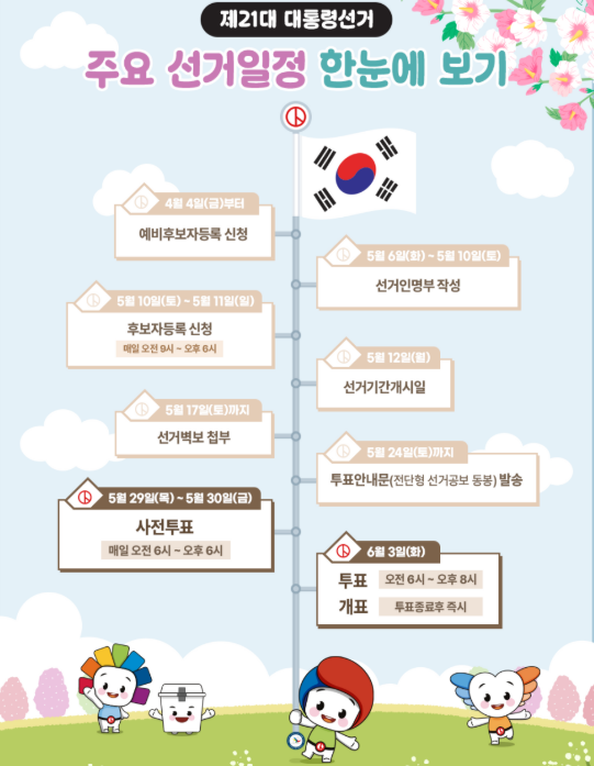 본 포스팅에서는 제21대 대선의 전체 일정, 투표소 안내, 사전투표 및 재외투표, 후보자 등록과 공식 선거운동 기간, 투표 절차 및 유의사항까지 자세하게 소개드립니다.