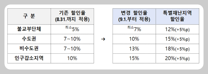 2025년 7월 기록적인 호우 피해로 특별재난지역으로 지정된 일부 지자체는 기본 할인율에 추가 5%p가 붙습니다.