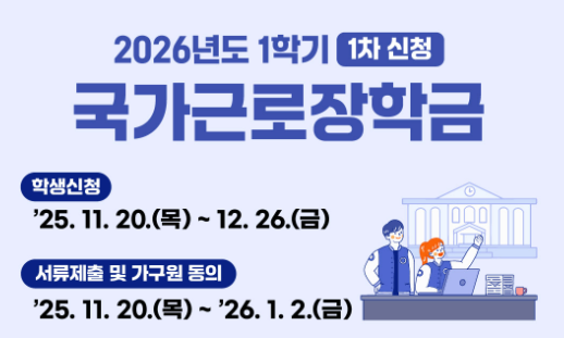 2026년 1학기 국가근로장학금은 2025년 11월 20일 ~ 12월 26일까지로, 학기 중 근로는 물론 방학 집중근로 프로그램까지 활용하면 매우 효율적인 장학 지원을 받을 수 있습니다.