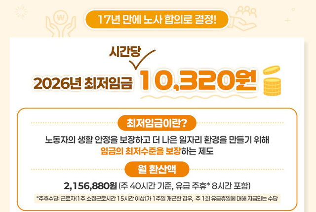 2026년 시간당 최저임금은 10,320원으로 확정되었습니다. 이번 최저시급은 17년 만에 노사 합의를 통해 결정되었다는 점에서 큰 의미를 갖습니다.