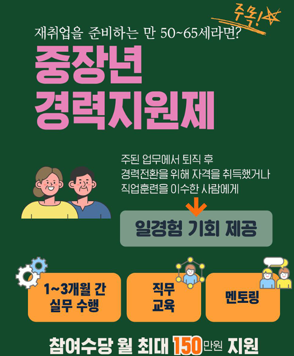 최근 정부는 만 50~65세를 대상으로 실무 중심의 일경험과 교육, 멘토링을 제공하는 중장년 경력지원제를 운영하며 참여자에게 월 최대 150만 원의 수당을 지급하고 있습니다.