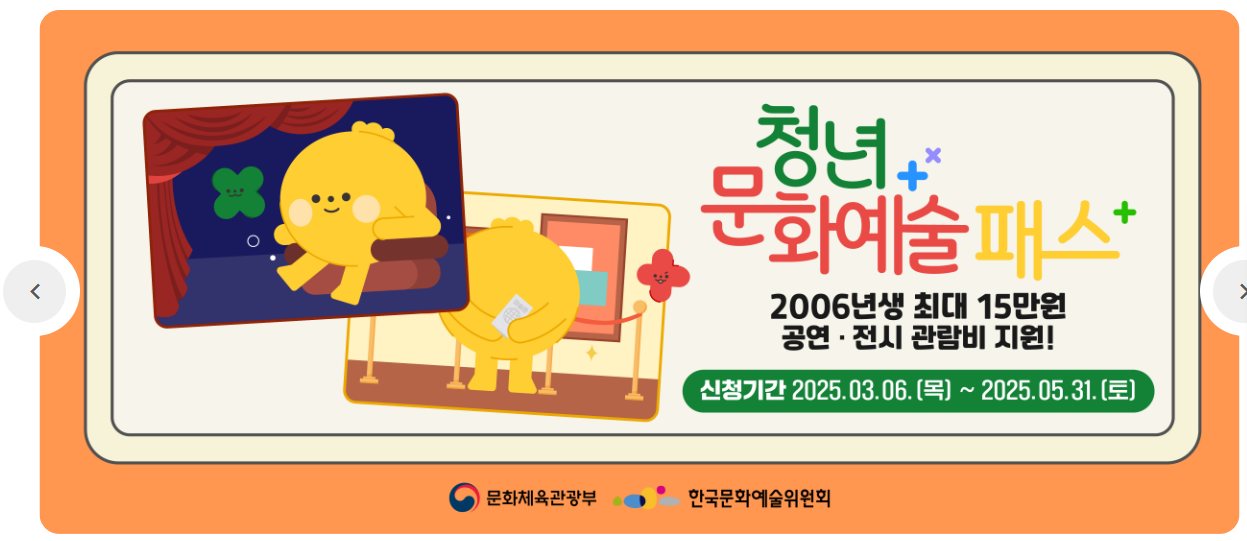 청년문화예술패스는 문화체육관광부와 한국문화예술위원회에서 주최하는 것으로, 청년들이 문화예술을 보다 쉽게 접근 할 수 있도록 만들어진 프로그램입니다.