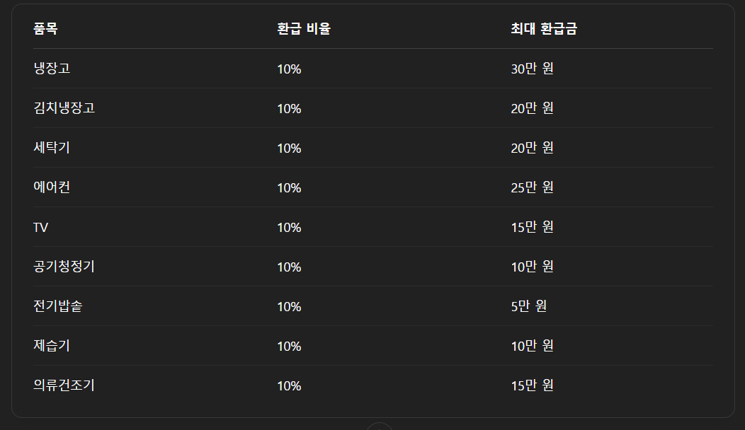 2025년 기준, 고효율가전 구매지원 대상 품목은 에너지소비효율 1등급 또는 1등급에 준하는 고효율 인증 제품으로 한정됩니다.