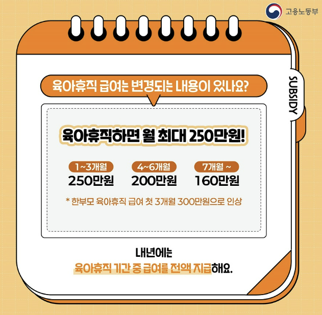 🔹육아휴직을 사용하는 사람이 ‘아빠’인 경우, 초기 3개월 급여 상한이 300만 원으로 일시 상향되는 ‘아빠육아휴직 보너스제’도 계속 유지됩니다.